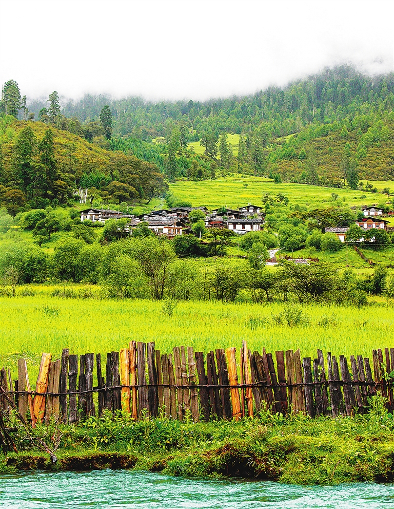 举目望去,整个林海如同笼纱一般,远处的南迦巴瓦峰在云雾缭绕之中不见踪影,正当我们为此叹息时,隐匿于林海之中的鲁朗小镇已经跃入眼帘。精致的藏式建筑,被黝黑的路划分为功能不同的分区,每一个建筑都能令你驻足欣赏。一条溪流穿镇而过,两边青青的草坡上,零星长着树木,间或有几处亭子,这布局又具有典型的欧洲风格,难怪这里有“小瑞士”之称。