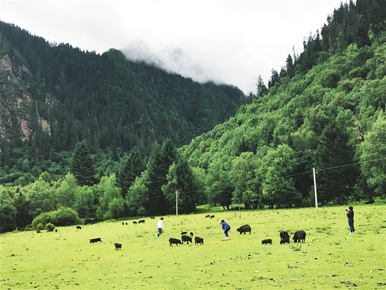 再往深处去,卓哥带领我们走进人迹罕至的鲁朗花海牧场。两侧青山由低往高分布着的灌木丛和茂密的云杉松树,将林海渲染成深深浅浅的绿;远处还有几座山峰覆盖着皑皑白雪,润泽着这片土地;绵延起伏的山岳上,覆盖着一层嫩绿的草甸,大草甸中零星点缀着藏式民居,牛羊在草甸上闲庭信步,悠然自得。阳光铺洒而至,雪山、林海、田畴构成一幅梦幻般的图画。藏民称这里为“神仙居住的地方”“叫人不想家的地方”,看来并未夸张。