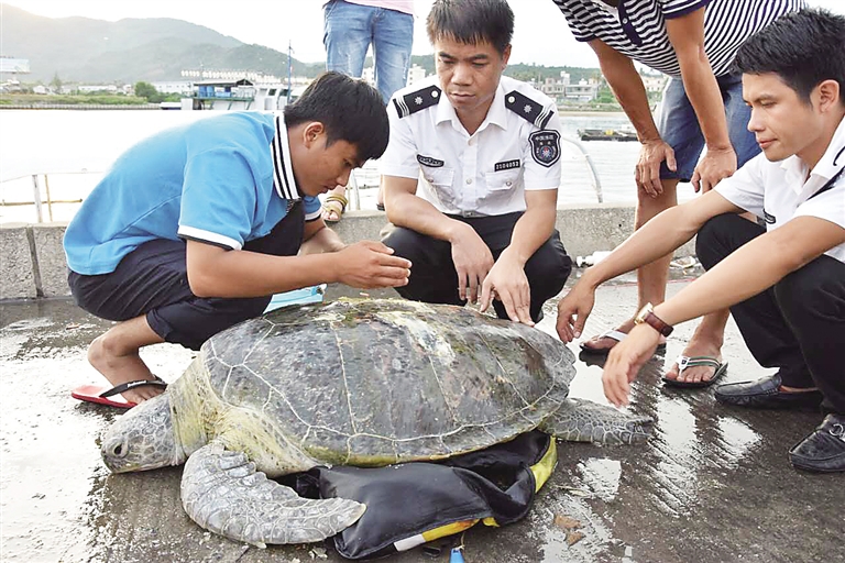 目前,这只海龟已经被送往陵水黎族自治县分界洲岛旅游区海洋馆救治。海龟长81公分,宽77公分,约50公斤左右。经鉴定,受伤海龟为绿海龟,属国家二级保护动物。为表彰吴育芳和陈存承爱护海洋生物的行为,万宁市海洋和渔业局分别奖励两人500元和1000元。据介绍,陈存承并不是第一次救助海龟,早在前几年,他在神州半岛海域附近撒网作业时,也捕到一只海龟并及时放生。