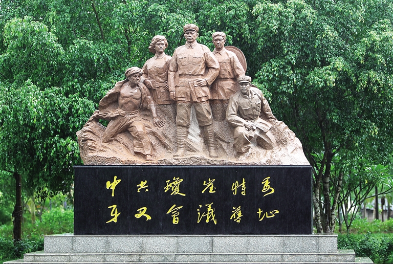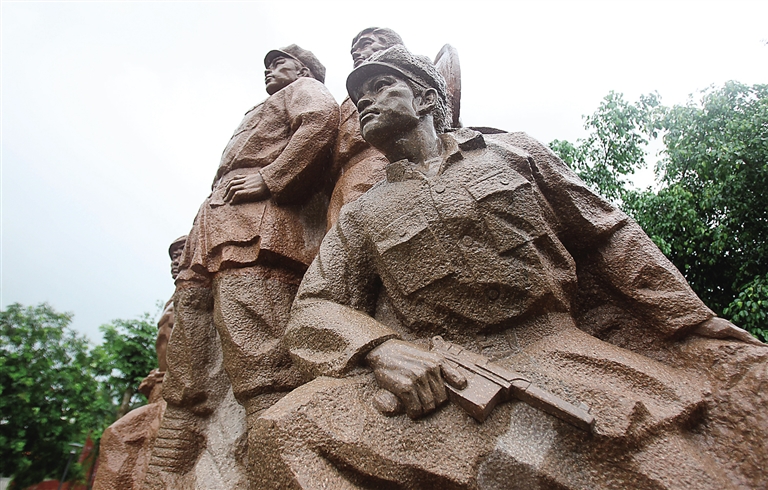 阵风扫过,几片落叶飘曳而下,落在白沙黎族自治县牙叉镇区的一个小广场上。正值放学,一群小学生在空地上嬉闹,孩子们时不时抬头,正对上了广场中央的中共琼崖特委牙叉会议旧址石雕群像那坚毅的眼神。