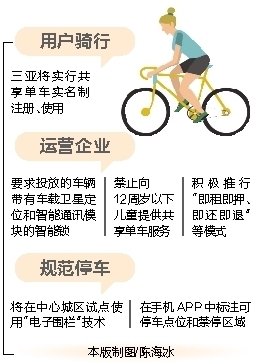 此外,为确保用户骑行安全,三亚将实行共享单车实名制注册、使用。要求运营企业实现对用户身份实时可查、事后倒查,禁止向12周岁以下儿童提供共享单车服务;公布计费方式和费用,实行明码标价,并积极推行“即租即押、即还即退”等模式,保障用户资金安全。