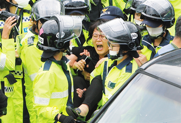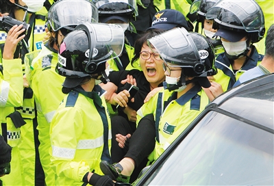 8时左右,10多辆运送“萨德”装备的运输车通过韶成里,驶向美军星州基地。道路两旁的民众愤怒地向运输车投掷矿泉水瓶、石块和烟幕弹,并不断地高呼和平口号,宣泄心中的悲愤。