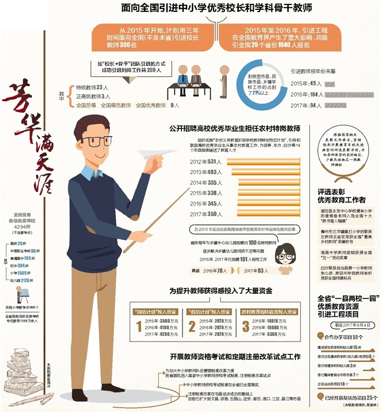 记者还了解到,一直以来,我省都积极落实国家免费师范毕业生就业工作,同时扎实推进思源学校学科骨干教师招聘工作:2011年至2017年共完成694名海南省籍国家免费师范毕业生回省就业工作,同时先后面向全国为24所思源学校招聘了26名校长和229名学科骨干教师。他们的到来,同样为成功打造教育扶贫移民样板工程奠定了坚实的人才和智力支撑。