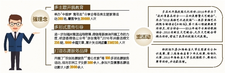 为了给学生们提供更优质的教育服务,该校还充分利用了海南“候鸟”人才优势,根据省教育厅工作要求,于2016年面向本科生组织实施了第一年冬季小学期,共邀请了20位省外专家来校给本科学生讲学,制定并分发给每一位学生学生手册。在组织学生开展的冬季小学期课程评价中,无论通识课程还是专业课程共30余场讲座深受学生好评。