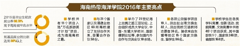 两年来,学院坚持“面向南海、面向东盟、面向国际旅游岛、面向产业发展”的办学定位,加快推进思想、学科、专业、师资、人才培养、治理结构、国际化办学等方面转型升级,校园基础设施建设、学科建设、对外交流合作等方面都取得了可喜的成绩,并逐步向建设国际化、开放性、应用型、有特色的高水平热带海洋类高校的目标阔步迈进。