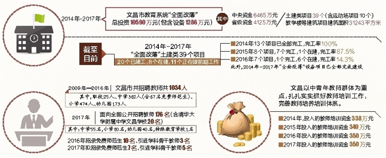 据了解,2009年—2016年,文昌市共招聘教师1034人,其中,职校25人、中学362人(含67名免费师范生)、小学474人、幼儿园173人。2017年文昌面向全国公开招聘教师176名(含清华大学附属中学文昌学校20名),其中:中学55名,小学80名,幼儿园40名,特殊教育学校1名。2016年招录免费师范生10名、引进学科骨干教师3名;2017年拟招录免费师范生7名、引进学科骨干教师5名。