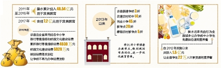 2014年至今,陵水累计投入资金3亿元改造义务教育薄弱学校,推行“全面改薄”工程,新建校舍面积4万平方米,促进了学校标准化建设。
