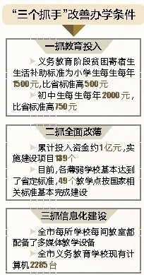 五指山市以“三个抓手”为突破口,全市办学条件明显改善。一抓教育投入。2017年上半年,五指山市义务教育阶段贫困寄宿生生活补助标准为小学生每生每年1500元;初中生每生每年2000元。教育扶贫(移民)学生交通费补助每生每年300元。今年又投入570多万元,将义务教育阶段建档立卡家庭经济困难学生的伙食费和学习生活用品费用全部纳入政府保障范围,由市财政全额保障。二抓全面“改薄”。五指山市结合各学校实际情况累计投入资金约1亿元,实施建设项目139个。三抓义务教育学校信息化建设。全市每所学校每间教室都配备了多媒体教学设备。