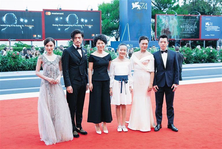 意大利时间9月7日,第74届威尼斯国际电影节主竞赛单元影片、中国导演文晏执导的新作《嘉年华》在威尼斯举行首映式,宣布该片将与其他20部影片共同角逐本届电影节最高奖金狮奖。图为演员彭静、耿乐,导演文晏,演员周美君、史可、王栎鑫(从左至右)亮相《嘉年华》首映式红毯。