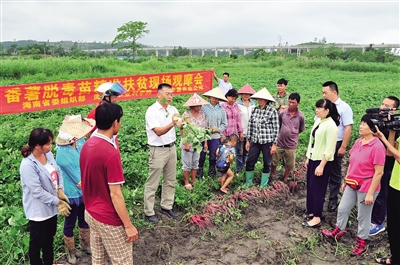 如今不少市县将地瓜作为促民增收的重要产业来抓,纷纷与省农科院合作,通过政府扶持脱毒种苗、科研单位负责技术培训和田间指导等模式发展地瓜产业。省农科院薯类研究中心通过建立示范户和示范基地,以点带面,培养农民专业合作社,支撑政府打造了“桥头地瓜”“美兰三角宁地瓜”“海头地瓜”“东方香薯”等4个品牌,并被分别列入上述市县的特色农业品牌,逐渐发展成精准扶贫品牌。