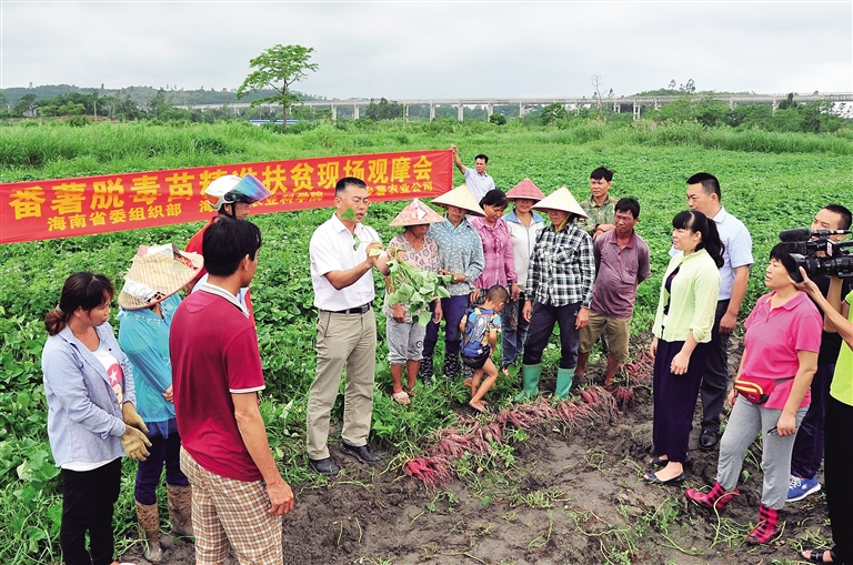 为助力脱贫攻坚,省农科院薯类研究中心设计了地瓜脱毒苗“造血式”精准扶贫项目,通过因地制宜示范推广地瓜脱毒薯、开展农民技术培训、组织企业收购等模式,先后成功在东方市大田镇老马村、临高县新盈镇龙兰村、儋州市王五镇峨答村、五指山市水满乡新村等7市县19个村实施了地瓜脱毒苗精准扶贫项目,推动地瓜种植成为当地农民增收的主要来源之一,小地瓜做成了大产业。
