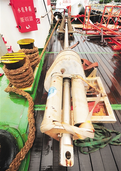 在“科学号”上,记者见到了给海底“量体温”的“体温计”,一根长7.5米、自重965千克的热流探针。据介绍,从“科学号”后甲板处由钢缆放入海底后,凭借额外增加的500千克配重,这支“体温计”可以竖直插入洋壳表层,也就是亿万年来形成的海底沉积层中。