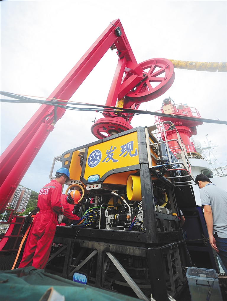刚登上“科学号”科考船,一个标着“发现”字样的设备就引起了记者的注意。“那就是无人缆控潜水器,也是海里的‘神抓手’。”吕亚军说,凭借这个“发现”号遥控无人潜水器,科考队员在西太平洋卡罗琳海山采集了大量深海样品,有指尖大小的螺,也有1米多高的海绵和大块岩石。