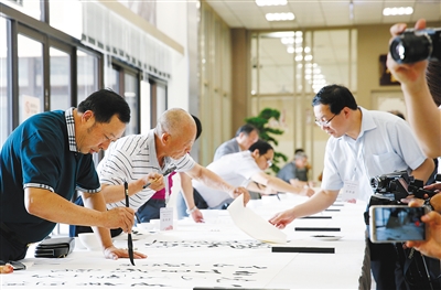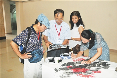 以书画会友,促进琼台两岛文化交流。9月6日下午,来自台湾的20名书画家来到海南大学,与海南书画家进行了一场主题为“中华艺术传承与创新——书画之美”的交流座谈,并于现场挥毫泼墨,互赠礼品。紧接着,他们还赶赴屯昌、保亭黎族苗族自治县、琼海等地进行参访交流。