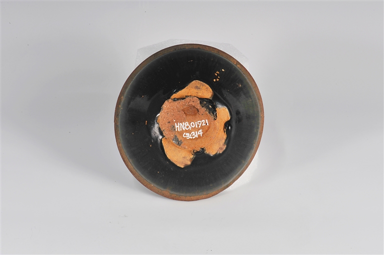 建盏的釉子是内外兼施,施釉以浸釉法为主,制瓷的匠人要手捏着底部的盏足,盏口朝下,浸入釉浆之中。所以如若细观建盏底部的胎面,有些依旧能微微看到手指的痕迹。从海南省博物馆藏黑釉兔毫盏的底部来看,还可看到黄褐色垫饼的残留,因窑中高温,盏底与垫饼胶结,虽已过八九百载,依旧不易脱落。浸釉后的建盏碗口朝上放平后,釉汁会沿着器壁由上而下自然流淌。因口部釉水下流后较薄,故而烧成后盏口多呈现出黄褐色;而盏的下部釉厚垂流,常可看到釉汁凝聚成突出器壁的水滴状釉块,省博和海口市博所藏的建盏上亦有这些特征。