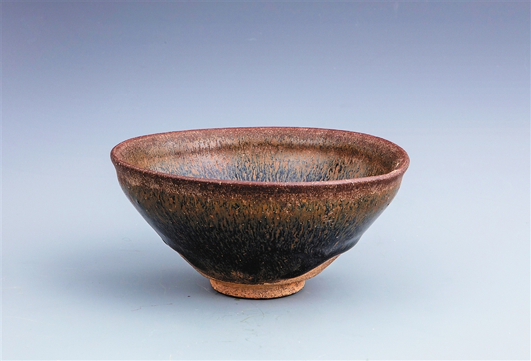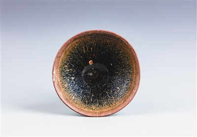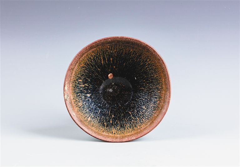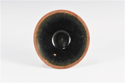 兔毫盏,是宋时饮茶的良配,因黑釉瓷盏上黄褐等色细长的条纹犹若兔毫,因而得名,以其创始地建窑所产最负盛名。建窑位于武夷山之南的建阳水吉镇,宋元之际为建宁府辖地,故以之得名。此窑创烧于晚唐五代,以两宋至元最是兴盛,主要烧制以黑釉为主的盏、碗、壶、瓶、罐等生活器皿,建窑能够在宋代享誉天下,倚凭的便是其烧制的黑釉茶盏。建窑黑釉盏以灰黑色胎质为主,又名“乌泥建”,其中比较常见的品种有兔毫斑、鹧鸪斑、窑变花斑等。