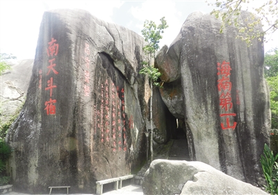 沿着“东山耸翠”石刻走出石胡同,攀援登高30多米,境界豁然开朗,路径平坦宽敞。自西而东两块巨石依次耸立,直插云霄,古称“插天石箭”。西石南壁刻有明万历四年(1576年)万州学宪林汝翥所题的“南天斗宿”大字,楷字竖排,距地9米,每字宽度达75公分;东石南壁刻有明崇祯十四年(1641年)万州牧曾光祖所题的楷体“海南第一山”,距地7.6米,字宽70公分,端正庄重,刚健有力,是东山岭标志性石刻,也是游客揽胜寻幽,留影纪念的必选之地。