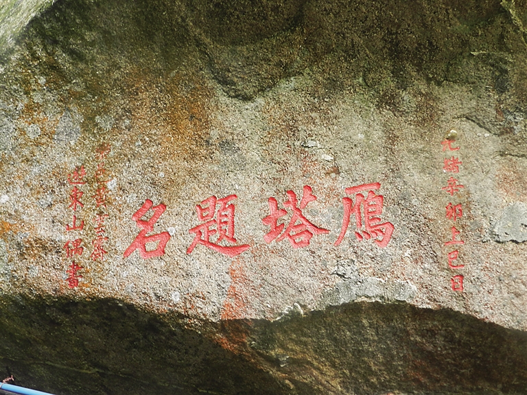 南边华封寺后然顶盖大石上有“雁塔题名”四个大字,是光绪辛卯年(1891年)乐会县(今属琼海)黄云霁所题;东侧石壁上有清同治十一年(1872年)海嵩氏所题“青云直上”大字;北边一斜硕石上有民国十年(1921年)万宁知事刘中珸题刻的“海外桃源”大字,形成一个正方形的格局。