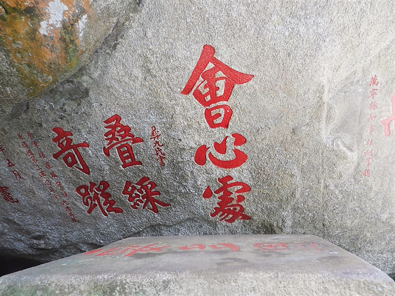 移步东登,便是华封寺前庭的“鳌驾石”,既是华封寺的照壁,也是屏风。其石南斜,遮日掩影又像一道走廊,刻有清代光绪二十一年(1895年)万州知事赵梦其所题“洞天福地”石刻。行字横排,朝南背北,距地3米,每字宽约66公分,笔锋犀利,活泼刚健,备受游客称道。华封寺后院的会心处,先人建有一方形石桌,四条石凳。石桌桌面刻有“要多思”三字,年代、何人题,已无考。西边石壁上刻有“会心处”三字。相传是古时炼丹道人、佛教僧人、耕读亭学子布道传经、研习国学的地方。