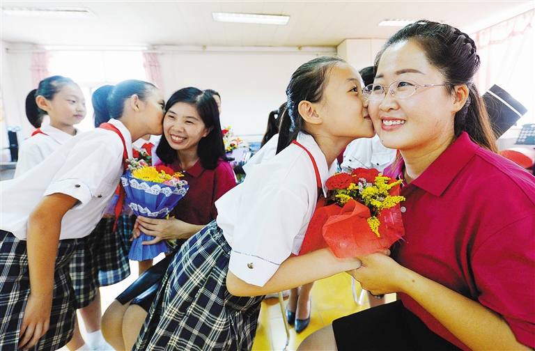 9月10日,河北省邯郸市明珠实验小学举办“巧手秀花艺 精心育桃李”主题活动,学生将手工制作的花束礼物献给老师。 当日是第33个教师节,全国各地用多种方式表达对老师的感谢和祝福。新华社记者 岳文婷 摄