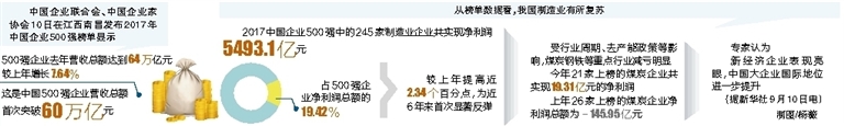 2017中国企业500强中的245家制造业企业共实现净利润5493.1亿元