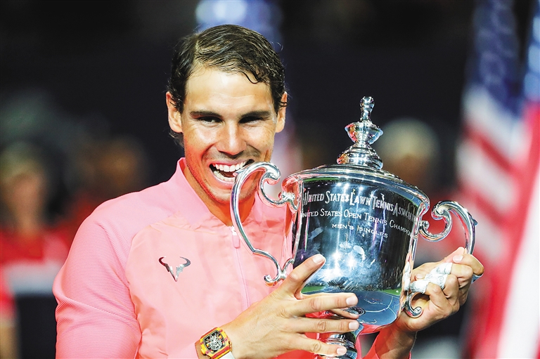 北京时间9月11日,在2017美国网球公开赛男单决赛中,西班牙选手纳达尔以3:0战胜南非选手安德森,夺得冠军。图为纳达尔在颁奖仪式上。 新华社发