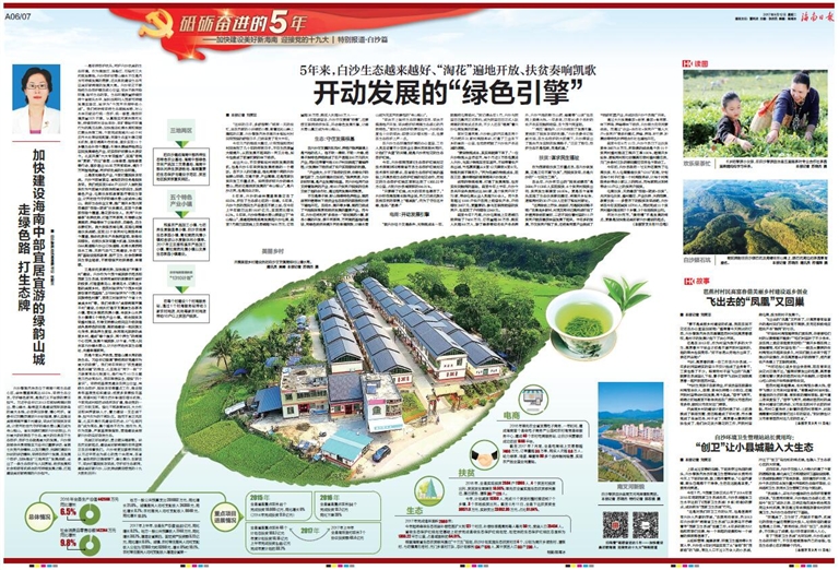 近年来,白沙不断突破交通不便、产业薄弱的制约,在群山环抱中开辟出“白沙电商”的发展路子,以互联网经济引擎推动经济社会发展。通过产业结构调整,白沙调减了橡胶等低效产业,发展南药种植等高效林下经济,既“护绿”,也“增值”。如今,“三地两区”的发展战略已经起步,白沙正在绿色发展的道路上稳步向前。