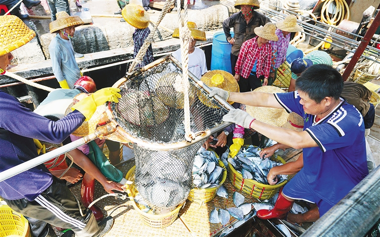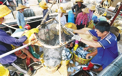 9月10日,文昌市清澜港码头,渔民们正忙着把渔货装筐过磅,销往省内外各地。据了解,8月16日南海开渔至今,清澜港码头今年渔货量约200多万斤,比往年同期增长了30%。本报记者 王凯 摄