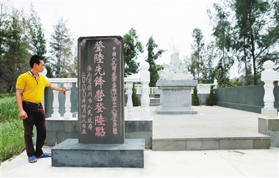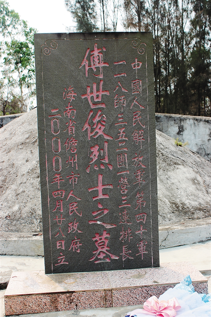 在儋州市白马井镇超头市村的海滩,在一片苍松和山花掩映下,修缮一新的登陆点纪念园内,两块石碑尤为醒目:前一块石碑的正面,镌刻着“中国人民解放军第四十军一一八师三五二团登陆先锋营登陆点”字样,背面是“登陆简况”;后一块石碑,则是“傅世俊烈士之墓”,他是解放军登陆先锋营三连排长。