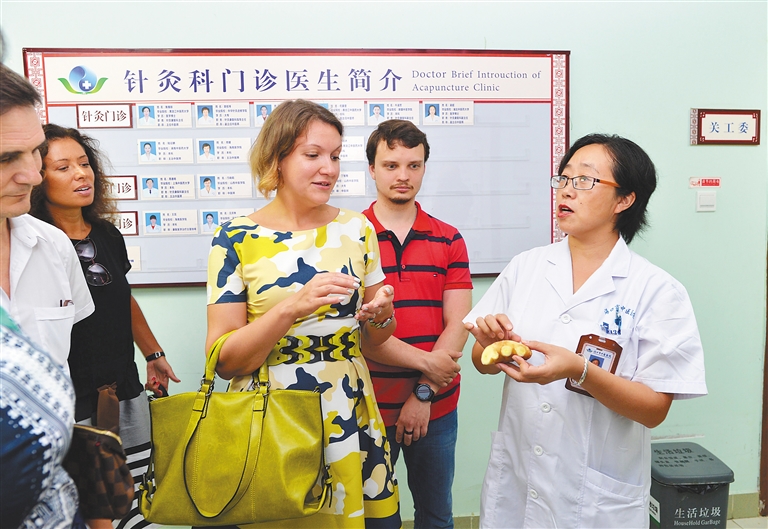 9月13日,莫斯科医疗代表团一行到上海中医药大学附属岳阳中西医结合医院海口分院(海口市中医医院)考察中医特色理疗。在针灸康复门诊,代表们仔细了解了针灸、推拿、拔火罐等传统中医理疗项目。
