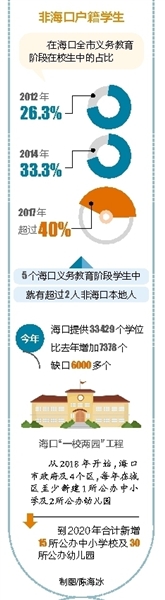 另有数据显示,非海口户籍学生在海口全市义务教育阶段在校生中的占比,已由2012年的26.3%、2014年的33.3%,跃升至今年的超过40%。也就是说,5个海口义务教育阶段学生中,就有超过2人非海口本地人。