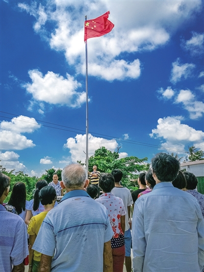 9月9日这天升旗,是为了迎接第33个教师节。在村里的小广场上,陈奕喜和文昌市湖山中学校长、厚禄村基金会秘书长陈川杰一起登上升旗台。国歌奏响,在父老乡亲们的注目下,国旗冉冉升起。
