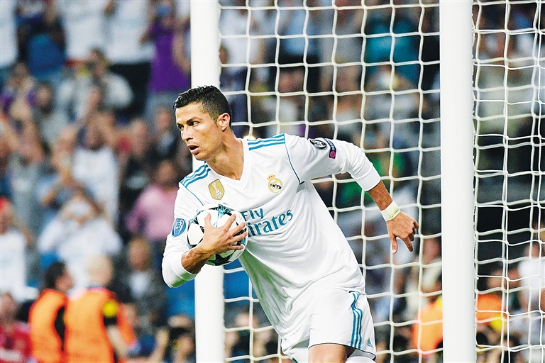 皇马球星C罗在与希腊人竞技的比赛中打入两球。图为C罗罚进点球后庆祝。新华社发