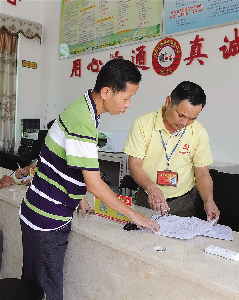 9月13日,澄迈县永发镇后坡村村民、“巷长”曾德春正在村委会办公室指导前来办理申请低保的农户们如何准备材料。“以前,村‘两委’班子人手不足,像整治卫生、办理业务、协调邻里纠纷等都让我们感到力不从心。”后坡村党支部书记曾令群告诉记者,今年1月起,村党支部充分发挥29名无职党员作用,利用“党建+巷长制”破解了这一难题。