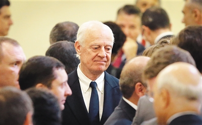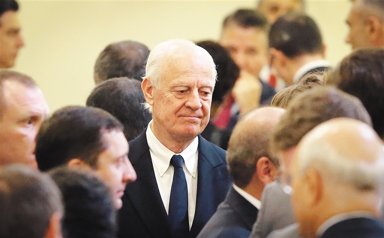 9月15日,在哈萨克斯坦首都阿斯塔纳,联合国秘书长叙利亚问题特使德米斯图拉(中)出席有关叙利亚问题的第六轮会谈。 为期两天的叙利亚问题会谈15日在哈萨克斯坦首都阿斯塔纳结束。俄罗斯、土耳其和伊朗在会谈结束后发表的联合声明中说,将在叙利亚设立4个冲突降级区,以确保停火协议得到执行并维护叙利亚领土完整。 新华社/法新