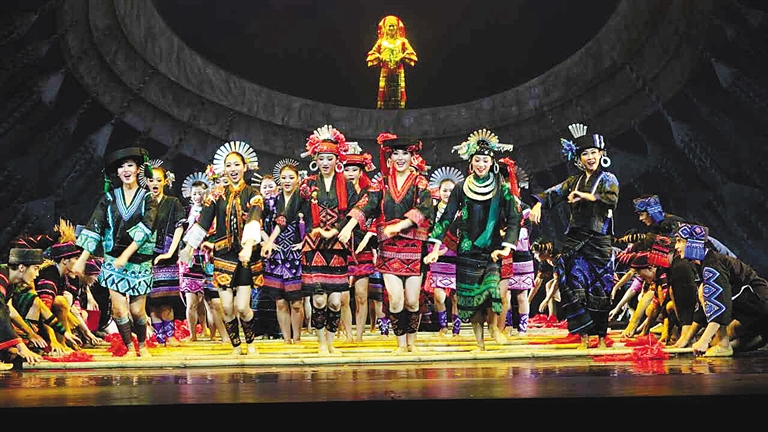 欢快的节奏、喜庆的配乐,在情景歌舞《出嫁歌》中,男女演员举着高高的竹竿“欢庆”,原本仅是烘托情绪的舞步,在修改后融入了海南打柴舞元素,令舞段更加饱满。犁杖、猪槽、牛铃……新增加的黎族乐舞《原色谱》,将生产工具独具匠心地变为乐器,展示着更多民族特色。
