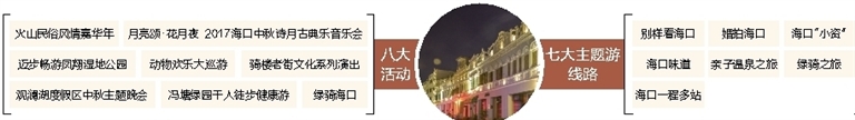 黄金周期间,海口将推出火山民俗风情嘉年华、月亮颂·花月夜 2017海口中秋诗月古典音乐会、迈步畅游凤翔湿地公园、动物欢乐大巡游、骑楼老街文化系列演出、观澜湖度假区中秋主题晚会等八大活动,进一步提升海口旅游的知名度和美誉度。