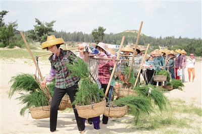 “早上5点出门,不仅要挑树苗,还要带着当天的口粮,沙地上煮出来的百家饭,味道可不怎么样。”文敬春笑言,当年有林业部门的技术人员来指导种植,看着海滩上一个个又黑又瘦的女人,惊得半天说不出话来。
