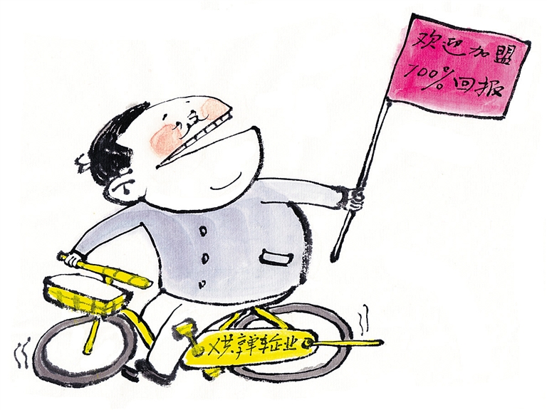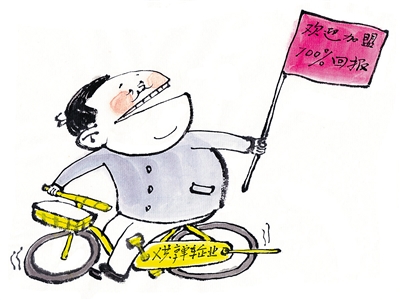 在行业饱和、竞争激烈、政策收紧的大环境下,共享单车企业倒闭跑路、押金难退、车辆故障等各种负面消息频出。一些中小共享单车企业采取加盟式经营策略,既是为了借力抢占市场,也可能是为了分散经营风险,更有可能是为了最后“捞一把”。将赚钱目标投向信息不灵敏的创业者,张口就是高回报率却闭口不谈投资风险,难免让人怀疑其是否在骗取加盟费。创业者还须擦亮眼睛,以免误入投资陷阱,有关部门也应加强管理,警惕新式加盟骗局扰乱社会秩序。这正是: