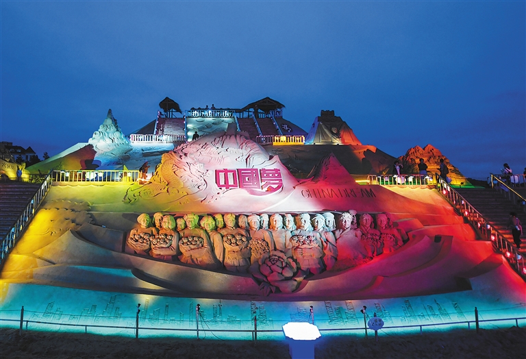 9月21日,现场展示的中国梦主题沙雕。 9月20日,以“一带一路·中国梦”为主题的中国舟山国际沙雕节在浙江舟山朱家尖南沙景区开园。来自中国、俄罗斯、荷兰、比利时、捷克、加拿大等6个国家的沙雕手历时近20天的时间,创作完成了主题沙雕、中国梦、21世纪海上丝绸之路、丝绸之路经济带等4个沙雕板块,共60余座沙雕作品。