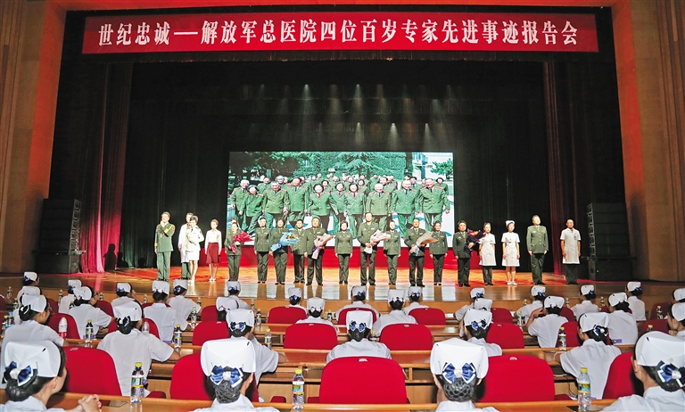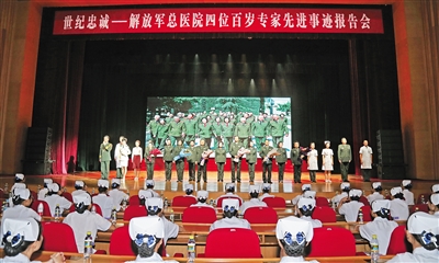 报告会现场,四位百岁军医感人事迹被解放军总医院21名医务人员以故事会的形式,运用视频、图片、音乐等多种形式进行深情演绎,形象刻画出了他们跨越世纪、忠诚于党的光辉形象。一个多小时的精彩讲述,赢得了台下无数次如潮掌声。