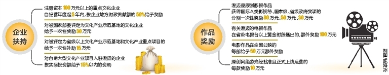 《意见》指出,澄迈县原创影视作品获得国际A类影视节、国家级、省级政府奖项的,分别一次性奖励80万元、50万元、30万元;反映澄迈题材,讲述澄迈人物、故事,宣传展现澄迈、提升澄迈知名度和美誉度的电视作品,在省级电视台以上黄金时段(19时至21时)播出的,额外奖励100万元,电影作品在全国公映的,每部给予50万元额外奖励;原创网络游戏经国家广电总局或工信部批准且正式上线运营的,每款奖励10万元。