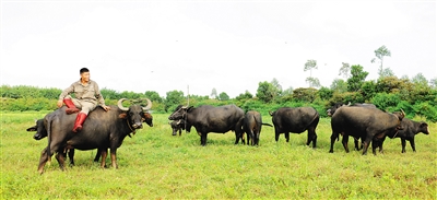 在澄迈县金江镇山口村一座养殖基地里,竹林下、小溪旁,一头头摩拉水牛正懒洋洋地躺在地上休憩。而一旁的90后“牛倌”李达宽却忙个不停:提桶倒水、增添草料、清理粪便……这样的工作,李达宽已经重复做了3年多,虽然衣衫无数次被汗水浸透,皮肤也被晒得黝黑,可他却乐在其中,“今年,我靠养牛已经挣了100多万元,预计到年底,还能再挣上200万元。”