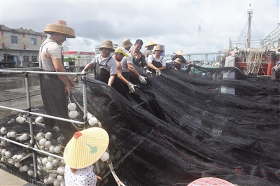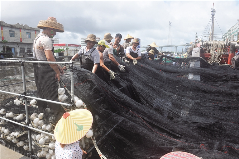 9月24日,文昌清澜港,靠岸停泊的船只连成一片,渔民抓紧时间整理渔具。