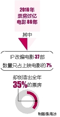 当下,一些在网络上发表的原生性内容,像科幻小说、历史小说、青春小说一旦拥有较高的关注度,很快就会被影视公司买断版权,继而改编成影视剧。据艺恩电影智库数据显示,2016年票房过亿电影数量86部,其中IP改编电影占据37席。其数量虽然只占上映电影的7%,但创造了全年35%的票房,IP电影的某种先天优势可见一斑。