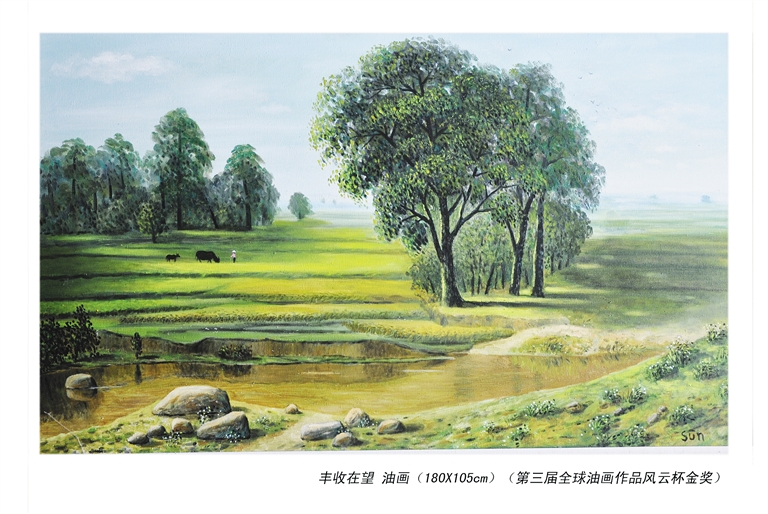 岸边长着数棵茂盛大树,一汪湖水倒映出绿色剪影,农妇牵着两头牛行走在田垄间,这是第三届全球“风云人物杯艺术成就”金奖作品《丰收在望》展示的画面。