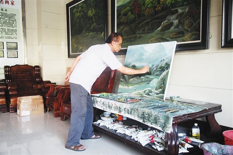孙国森作画的地方设在自家厅堂一侧,一张木桌,一堆颜料,甚至没有座椅,只能弯着腰画画。“以前在画室作画,现在图方便就在大厅。”孙国森说,多年下来只要有画板和颜料,在哪里都能作画。