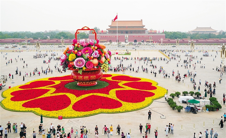 25日拍摄的天安门广场中心花坛“花果篮”。 9月25日凌晨,天安门广场中心花坛“祝福祖国”巨型花篮布置完毕。今年的大花篮以喜庆的“花果篮”为主景,篮内摆放着柿子、石榴、苹果以及牡丹、玉兰、月季等仿真花果,寓意十八大以来我国在各领域取得的辉煌成就。“花果篮”顶高17米,篮体高15.3米,底部直径达50米。 新华社记者 殷刚 摄