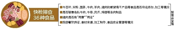 省食药监局采取“两不一直”(不预先通知、不打招呼,直奔商户和生产加工经营现场)的方式,对牛百叶、米粉、面条、牛肉、羊肉、猪肉和散装海干产品等食品是否非法添加、加工等情况进行拉网抽检,对是否销售走私牛肉、牛排、凤爪、鸡翅等冻肉制品,对猪肉是否有“两章”(动物检疫合格印章、肉品质量检验合格印章)和“两证”(动物检疫合格证明、肉品品质检验合格证),对旅游餐饮持证、食材来源、加工制作、食品安全管理等情况进行排查。