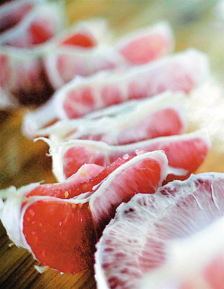 当剖开红心蜜柚那金黄色的薄薄的外皮,就会看到淡红色的片片瓤瓣,瓤瓣色泽鲜艳、十分诱人。翻开瓤瓣,瓤肉无籽,粒粒菱形的砂瓤晶莹剔透,赏心悦目,入口一尝,脆嫩无渣,柔软多汁,清甜微酸,味道永携,不仅具备白肉蜜柚的营养成分,而且红肉蜜柚所含的天然色素对人体具有一定的保健作用。据了解,儋州蜜柚浑身都是宝:柚肉鲜食甘酸适口、柚花可入药,但鲜为人知的是儋州柚皮也可以食用,它不仅营养丰富,还具有暖胃、化痰、润喉等功效。